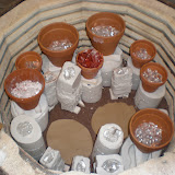Kiln #1 was packed by me, Jen, Jesse T, and Sonya. In this picture, the two large molds in the back are the bowls, the red flowerpot is the apple, and the three small flowerpots, one to the left and two to the right of the bowls, are the hand pressings. The space holders are for Jen’s bowls, the large flat mould is Jesse’s, which a shaved 6” off of all the way around to fit it in, the large mold on the left is Sonya’s last heart. The rest are Jen’s keys.